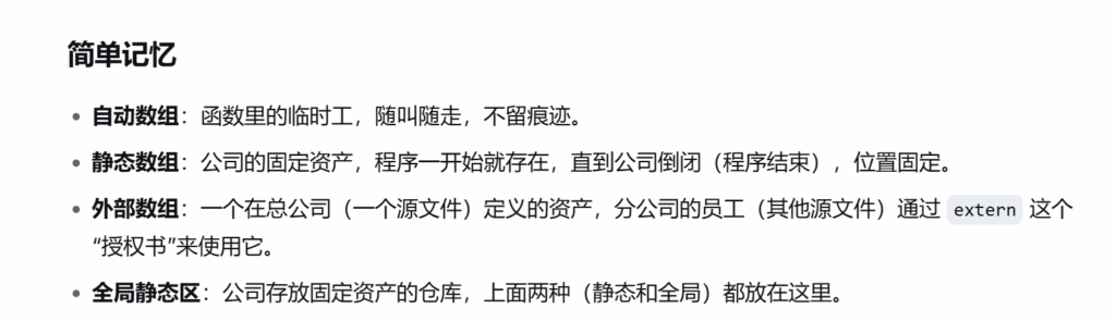 外部存储型数组extern(在另一个文件中定义)所有声明它的文件整个程序运行期全局/静态区(在定义处初始化)