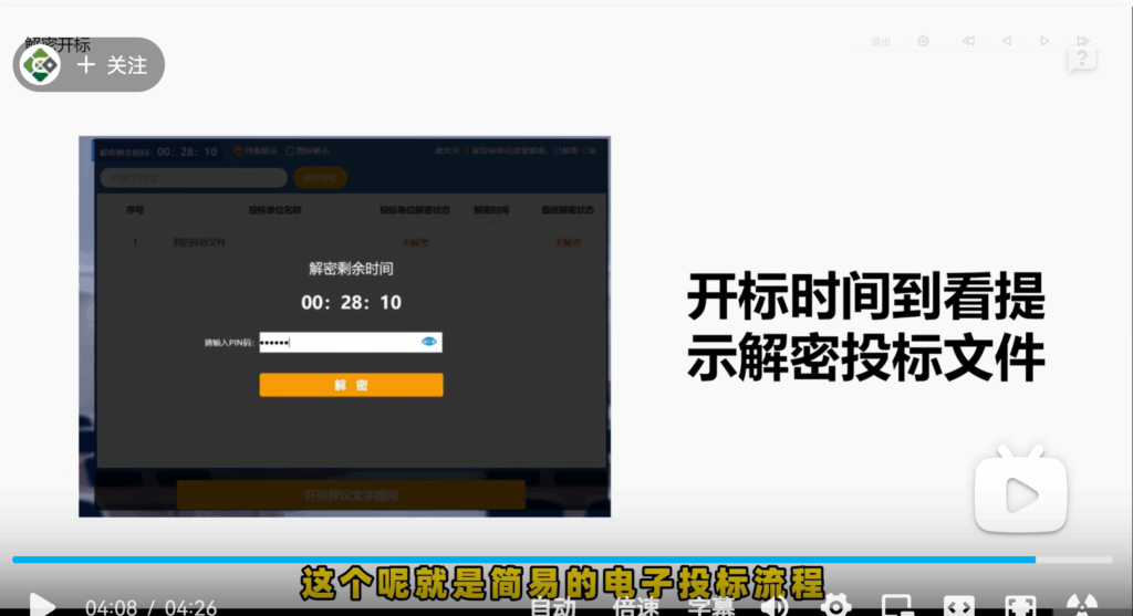 - 解密开标:(提前半小时登陆招标平台,进入开标大厅,找到对应项目并进入,等待时间到了,开始解密)